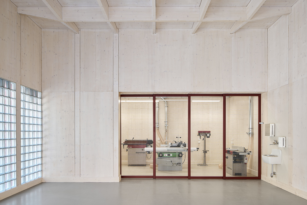 Auf dem Gelände der Alten Feuerwache Köln hat das Kölner Büro Bachmann Badie eine öffentliche Holzwerkstatt für die Stadtteilgemeinschaft realisiert. Der Neubau ersetzt eine frühere Lagerhalle und fügt sich in Höhe und Kubatur in die bestehende Umgebung ein. Der zentrale Werkraum besticht durch seine Höhe und das klare Holzdesign, während die Fassade mit feinen Holzornamenten Akzente setzt und Einblicke ermöglicht. Maschinenraum und Lager sind in angrenzenden niedrigeren Bereichen untergebracht. Der Bau folgt dem Prinzip des zirkulären Bauens: Tragwerk und modulare Verglasung lassen sich leicht wiederverwenden, der Materialeinsatz wird minimiert.