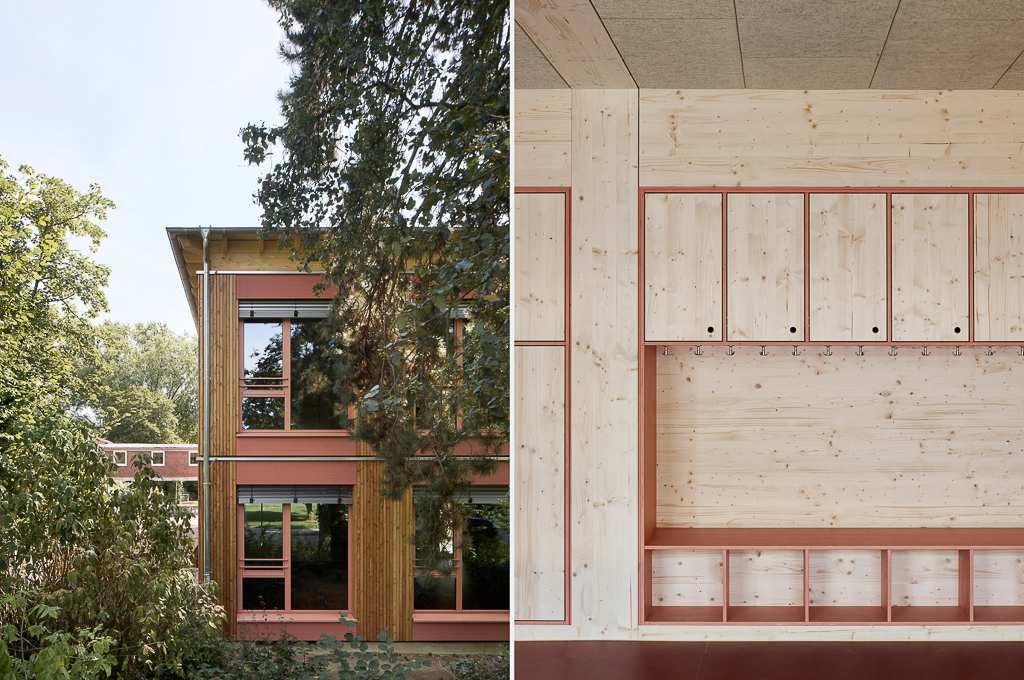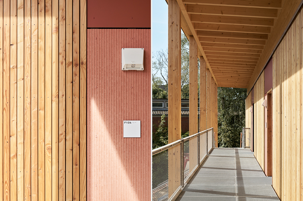 Für zwei Kölner Grundschulen entstanden modulare Schulgebäude in Holzbauweise. Entworfen von baut architektur und umgesetzt von Blumer Lehmann, zeichnen sich die Bauten durch eine klare Struktur und eine ruhige, funktionale Gestaltung aus. Die Gebäude bestehen aus wiederverwendbaren Modulen, die über einen außenliegenden Laubengang verbunden sind. Großzügige Fensteröffnungen sorgen für eine helle Lernatmosphäre und betonen die reduzierte Materialität der Holzbauten.